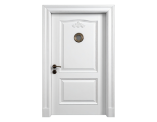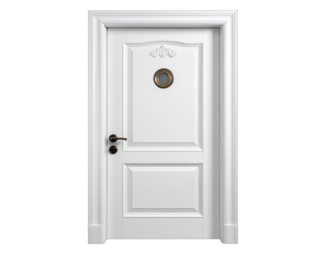White interior door with a peephole and decorative elements. It has ornate details, hardware