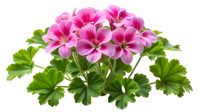 Beautiful arrangement of vibrant pink geranium flowers with lush green leaves