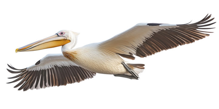 Majestic brown pelican soaring gracefully with wings spread against a deep isolated on white background