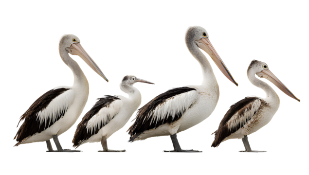 Australian pelicans standing in various poses on a white background