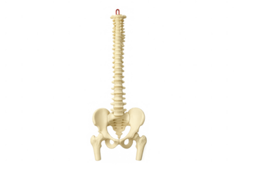 Human spine and pelvis showing vertebrae, sacrum, coccyx, and hip bones on transparent background