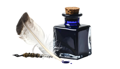 Quill pen, ink bottle, and feather. Writing tools for calligraphy