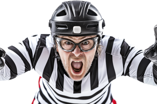 Referee woman issuing penalty to energetic brazilian soccer supporter on transparent background