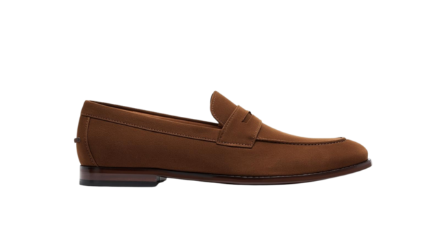 Brown Suede Penny Loafer Shoe for Men. Elegant Men's Footwear with Classic Style Isolated on Black Background.