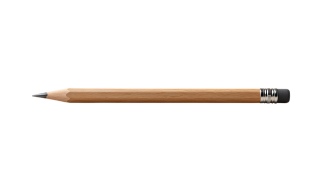 Wooden pencil with eraser isolated PNG on transparent background, writing instrument for drawing, sketching, and note-taking