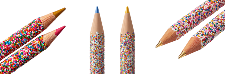 Set of Brightly colored pencil laying horizontally on a white surface, tiny confetti dots scattered around, sharp focus on transparent png background. Ai generated