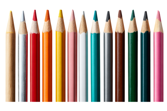 Assorted color pencils arranged closely with vibrant hues on a solid transparent background, showcasing their tips and textures, fully isolated for visual clarity.
