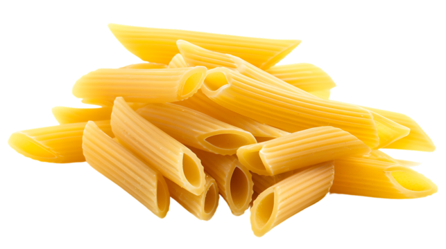 raw Penne Rigate, uncooked Italian Pasta, isolated on white background, full depth of field