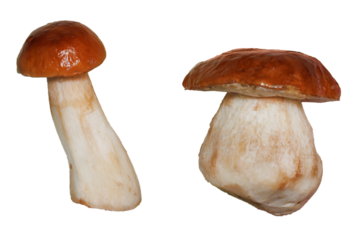 Fresh raw organic boletus edulis mushrooms with brown caps are isolated on a white background as a healthy forest fungus ingredient