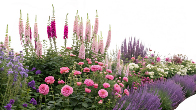 cottage garden flower bed  brimming with a casual on white background PNG. AI GENERATED