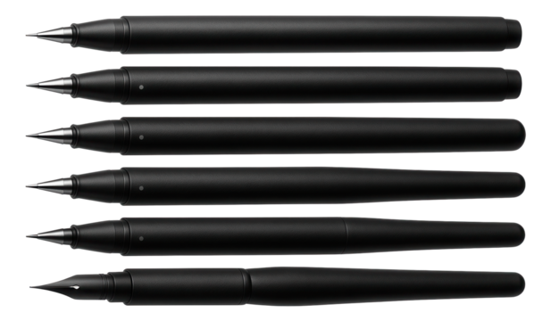 Six sleek black pens with varying nibs arranged side by side on transparent background.