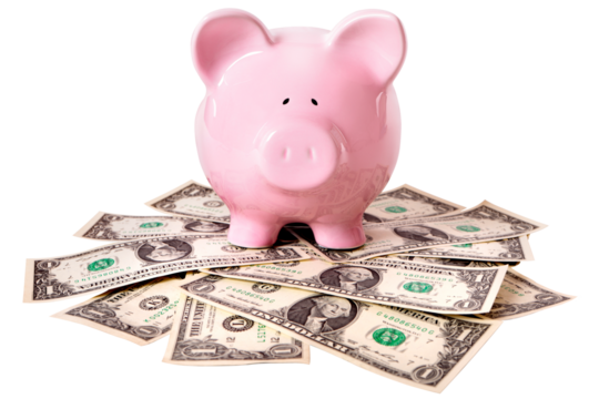Piggy bank with US dollars saving concept isolated transparent background photo PNG file