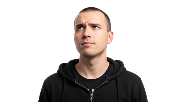 A man in a blue shirt is isolated on transparent background and appears to be thinking or worried with his finger on his face