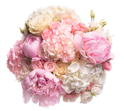PNG. Luxurious round bouquet of pink and white peonies, roses, hydrangeas and Asian buttercups