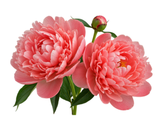 Two large pink peonies with a bud and green leaves isolated on transparent background