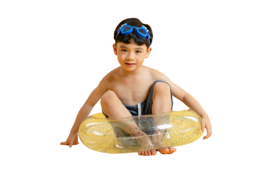 Asian kid A young boy sitting in a yellow inflatable tube, with swimming goggles on. A picture of a happy boy at summer.