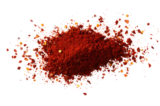 Coarse ground black pepper flecks of various particle sizes scattered on a transparent background, top-down flat lay, extreme macro shot, concept for culinary ingredient advertising