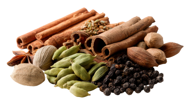 Black, Green, White, and Pink pepper seeds, pile of aromatic peppercorn spice, dried cooking spicy ingredients, graphic element isolated on a transparent background