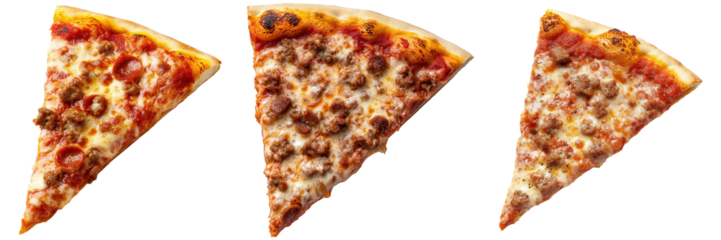 Three flavorful New Yorkstyle pizza slices with pepperoni and sausage.