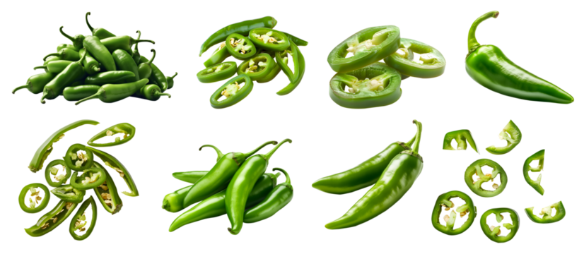 Green chili chilli chilies pepper fruit vegetable, many angles view side top front group slice cut on transparent background cutout, PNG file. Mockup template for artwork graphic design