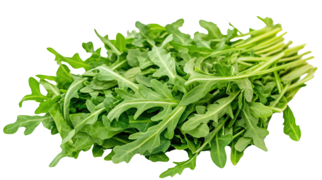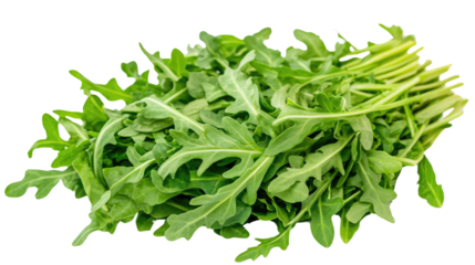 A fresh pile of vibrant green arugula salad leaves isolated on a clean transparent background png.