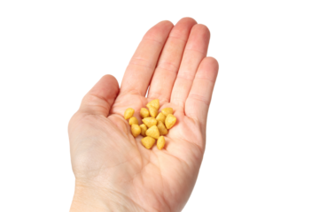Hand with hydrolyzed soy protein cat food. Veterinarian prescribed hypoallergenic diet for cats or dogs with food allergies or gastrointestinal issues. Low molecular weight peptides. Selective focus.