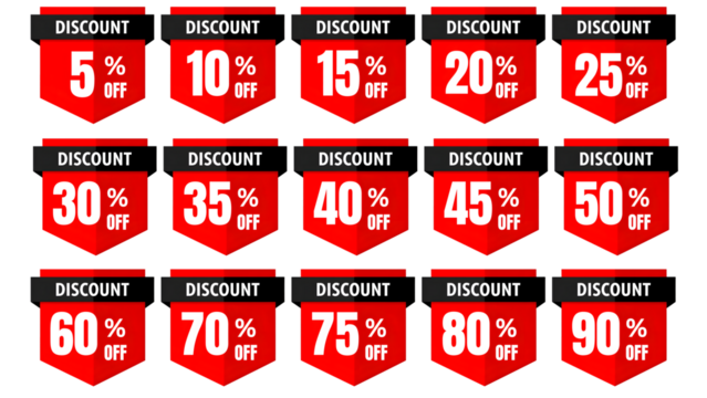 Red discount tag with 15 percent off in bold white text on transparent background, PNG