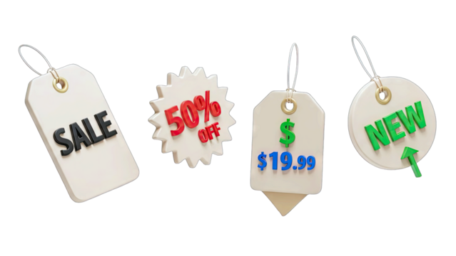 Multiple 3d discount percentage tags advertising isolated on transparent background