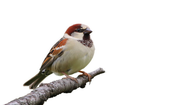 House sparrow perched on branch with transparent background