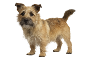 Small terrier dog with wiry tan coat, darker muzzle, and perked ears, isolated on transparent background