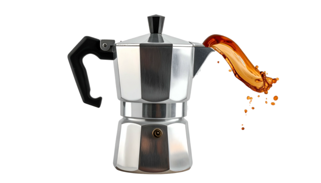 Silver stovetop espresso maker pours out coffee