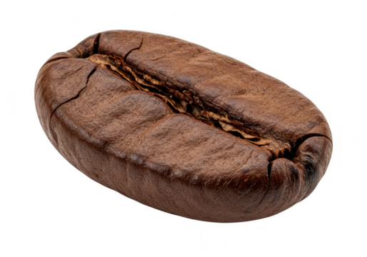 A single detailed macro shot of a roasted coffee bean with a prominent crack down the center isolated on a transparent background