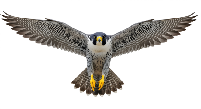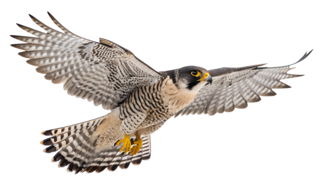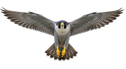 A majestic wild peregrine falcon bird is captured in powerful flight, with its impressive wings spread wide, isolated against a clear background.