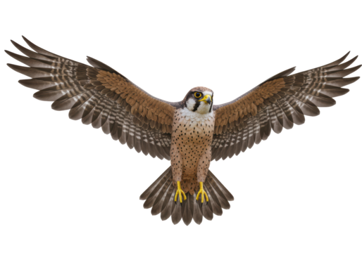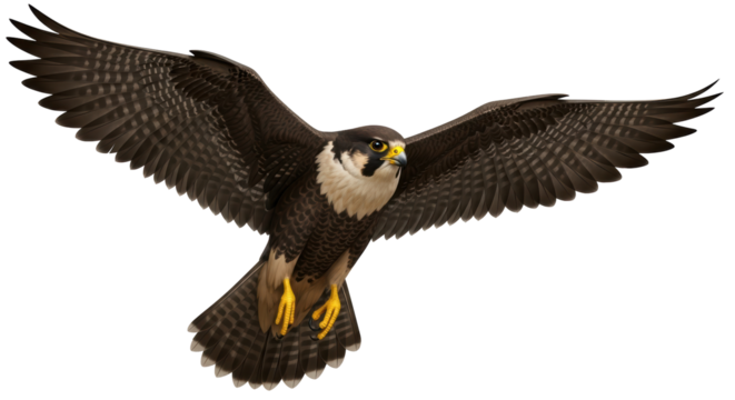 A peregrine falcon flying with its wings spread wide on transparent background , png
