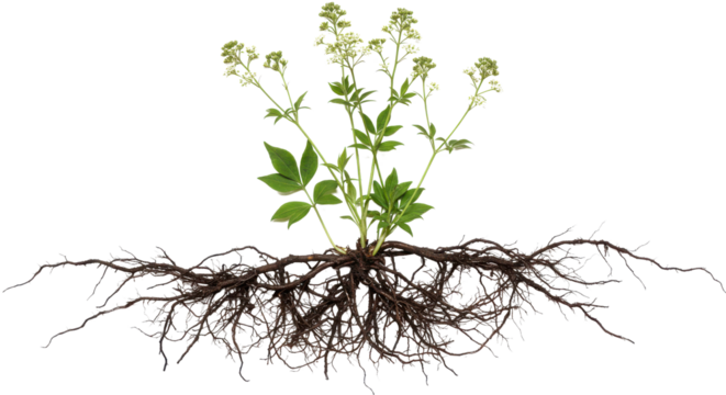 Isolated Green Plant with Exposed Root System and Small White Flowers