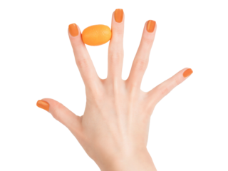 Woman hand with perfect skin and orange nail polish holding small orange citrus fruit between the fingers. Isolated png with transparency