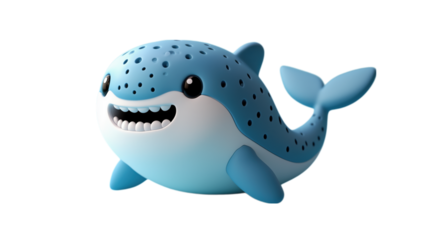 A cute and playful blue cartoon whale character with a big smile and small fins, perfect for children's toys and animated content. Ideal for animation, toy promotions, and playful character branding.