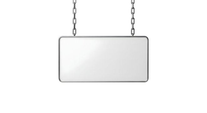 A blank rectangular sign, suspended by metal chains, perfect for your custom message. The sign is set against a clean backdrop, ready for your message, isolated on transparent background
