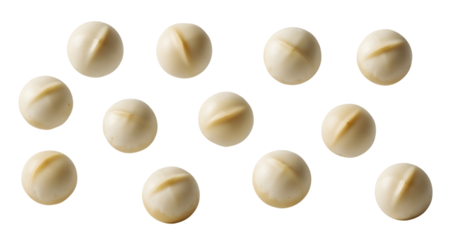 Several whole, shelled macadamia nuts levitating in a clean, scattered pattern. The nuts are creamy white and perfectly round. Photorealistic  with soft lighting on a transparent background.