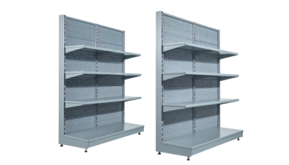 Two retail shelves, side-by-side, with adjustable shelves and a perforated back panel