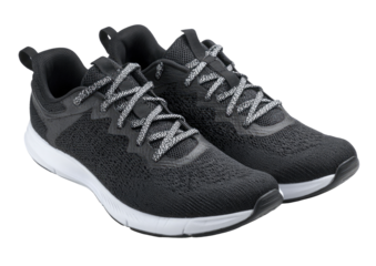 Pair of black athletic shoes.  Lace-up design,  perforated mesh upper,  light gray accents on laces and sole.  Comfortable,  functional style