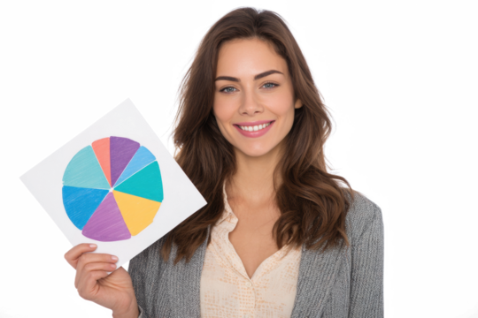A smiling businesswoman holding a colorful pie chart, representing financial data or business analysis.