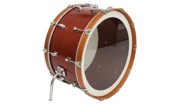 Isolated bass drum facing left, studio image of musical instrument, deep and resonant tone