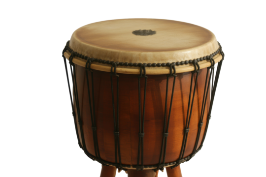 Traditional wooden rope drum with drumsticks, percussion instrument creating rhythm and folk music, transparent background