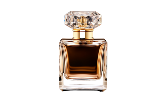 Elegant square glass perfume bottle with golden cap isolated on transparent background