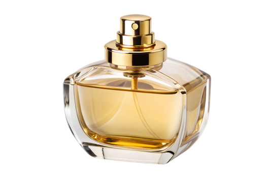 Perfume bottle for men, Parfum in Beautiful Gold Glass Bottle isolated on transparent and white background.PNG image.