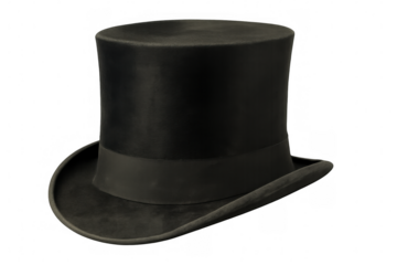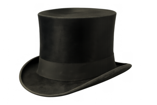 Vintage black top hat sitting against transparent backdrop, symbolizing elegance, formal attire, perfect for period productions and theatrical costume design