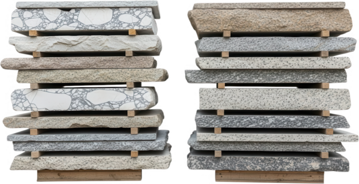 Stacks of varied granite and marble slabs are neatly arranged on wooden pallets showcasing diverse stone textures and colors for construction purposes building material natural rock