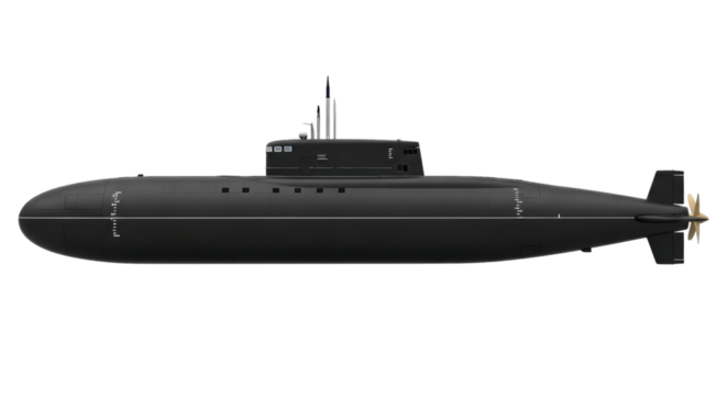 Black military submarine side view on transparent background