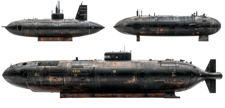 Three rusty submarines on transparent background